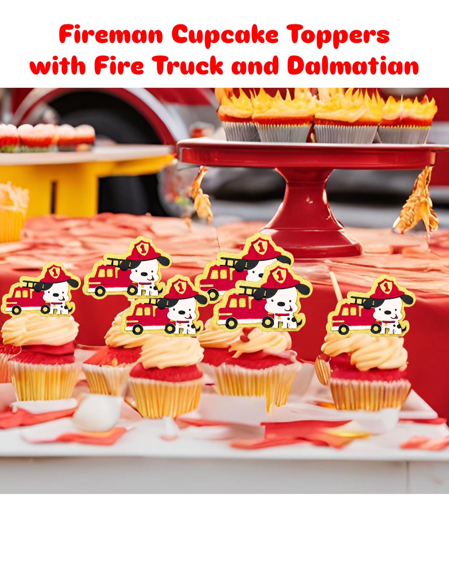 Fireman Themed Cupcake Toppers with Fire Truck and Dalmatians