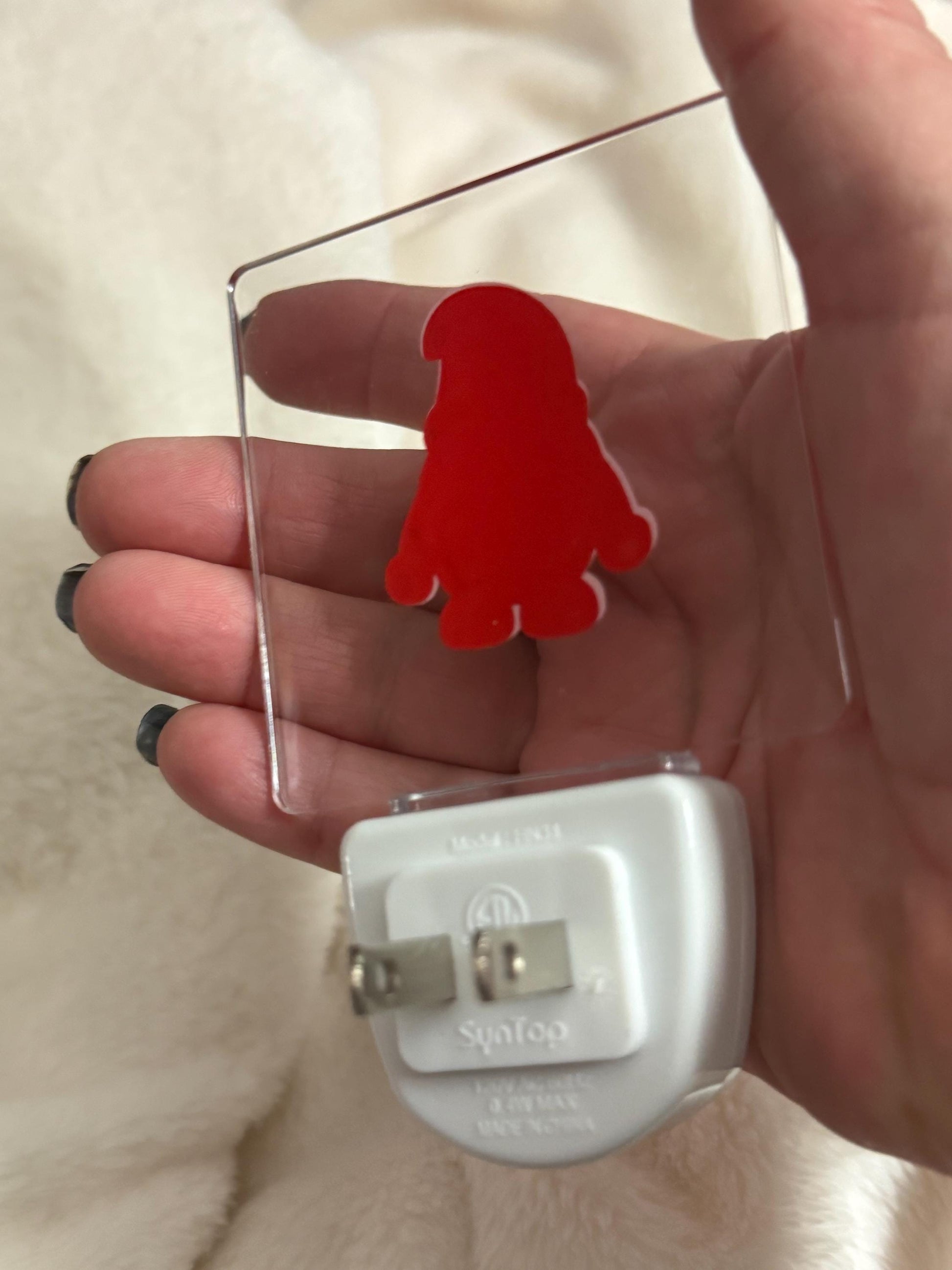 Gnome nightlight for the holidays. Perfect for hallways, bathrooms, kitchen or any cozy corner, this 2.5-inch square plug-in nightlight emits a soft blue glow that brings warmth and whimsy to your holiday decor.